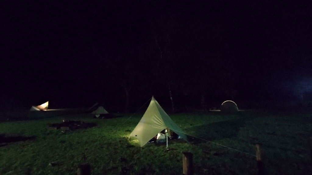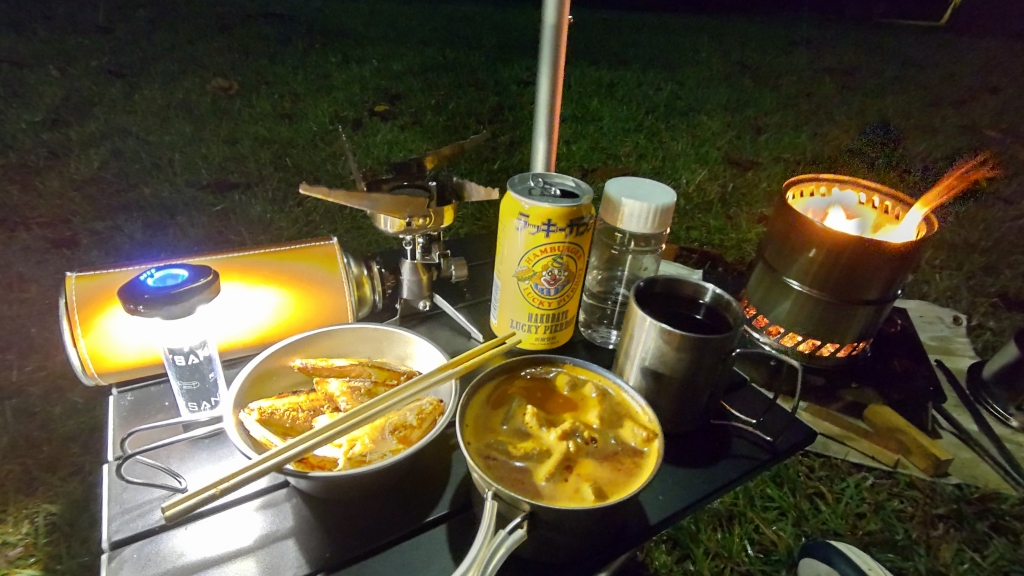 久しぶりの雨の設営。またまた久しぶりの焚火。焚火がうれしい季節になりました。